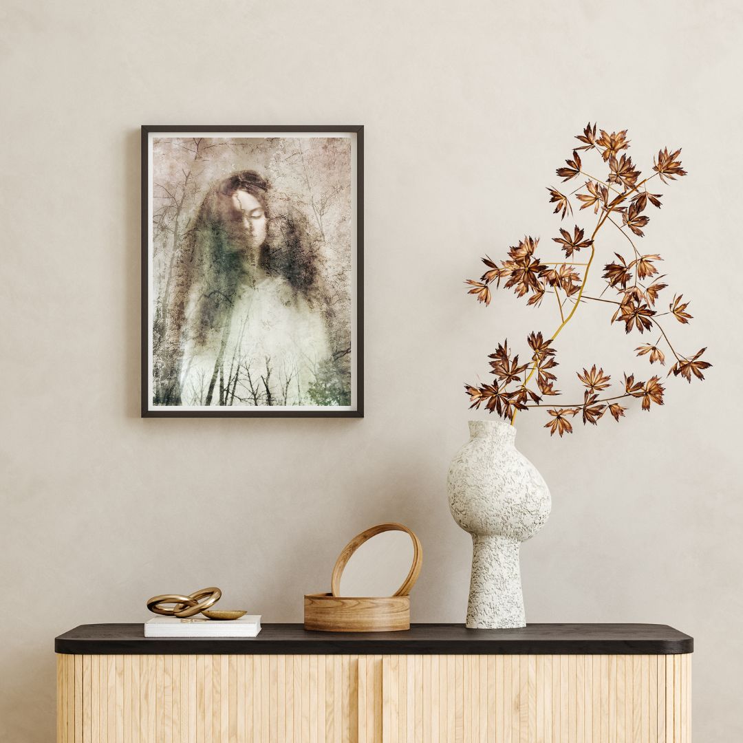 The images presented here are photographic reproductions of one-of-a-kind portrait and landscape artworks Helena creates in her art studio. For the original pieces, she uses various media and techniques, from shooting with an infrared camera to add a certain otherworldliness to her colors, to printing the different image layers on fragile rice paper before sealing them with encaustic.